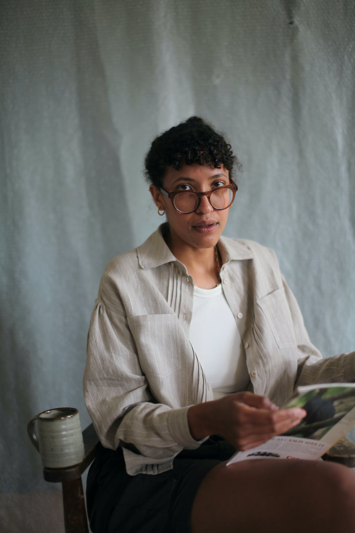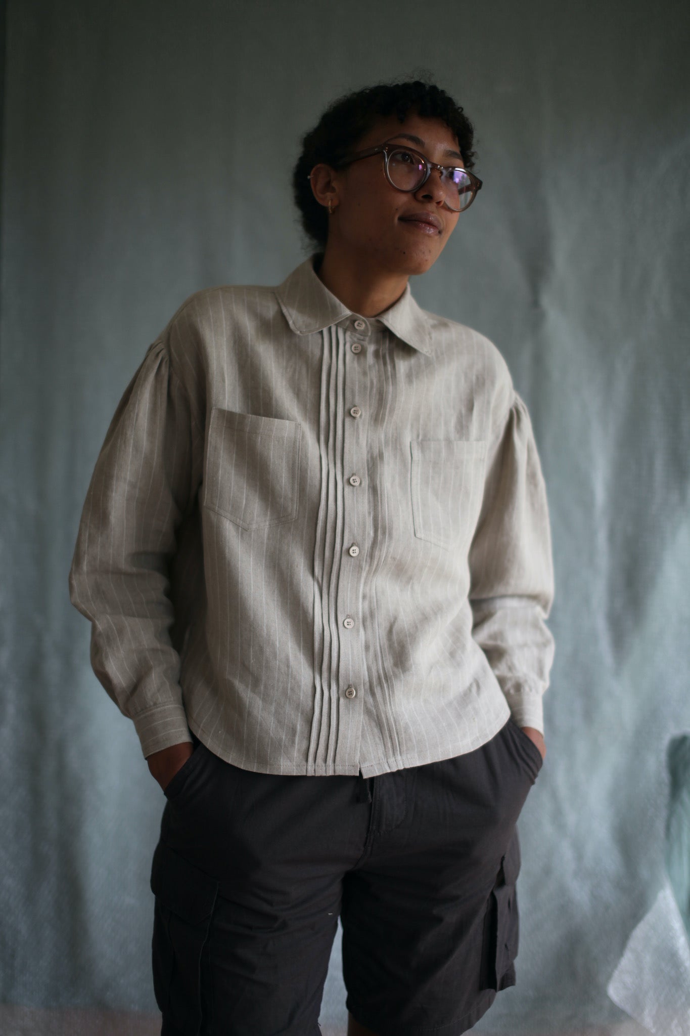 The Thea shirt in Oatmilk is an 100% linen shirt in an oaty ecru colour with a fine white stripe. The matte off white buttons are made from compacted cotton fibres. It is a loose fitting slightly cropped linen shirt with side splits. It has two breast pockets, fine pleats down the centre front either side of the button stand, and flat piping around the collar edge which reflects the pleats. The sleeves are extra drop shouldered and voluminous, gathered at the sleeve head tapering towards the cuff. It looks great worn open, sleeves rolled up, or smartly buttoned up to the collar! It is long enough to wear tucked in with high/mid waist trousers.