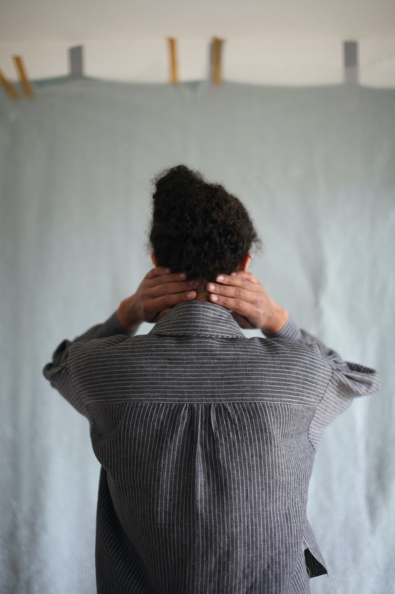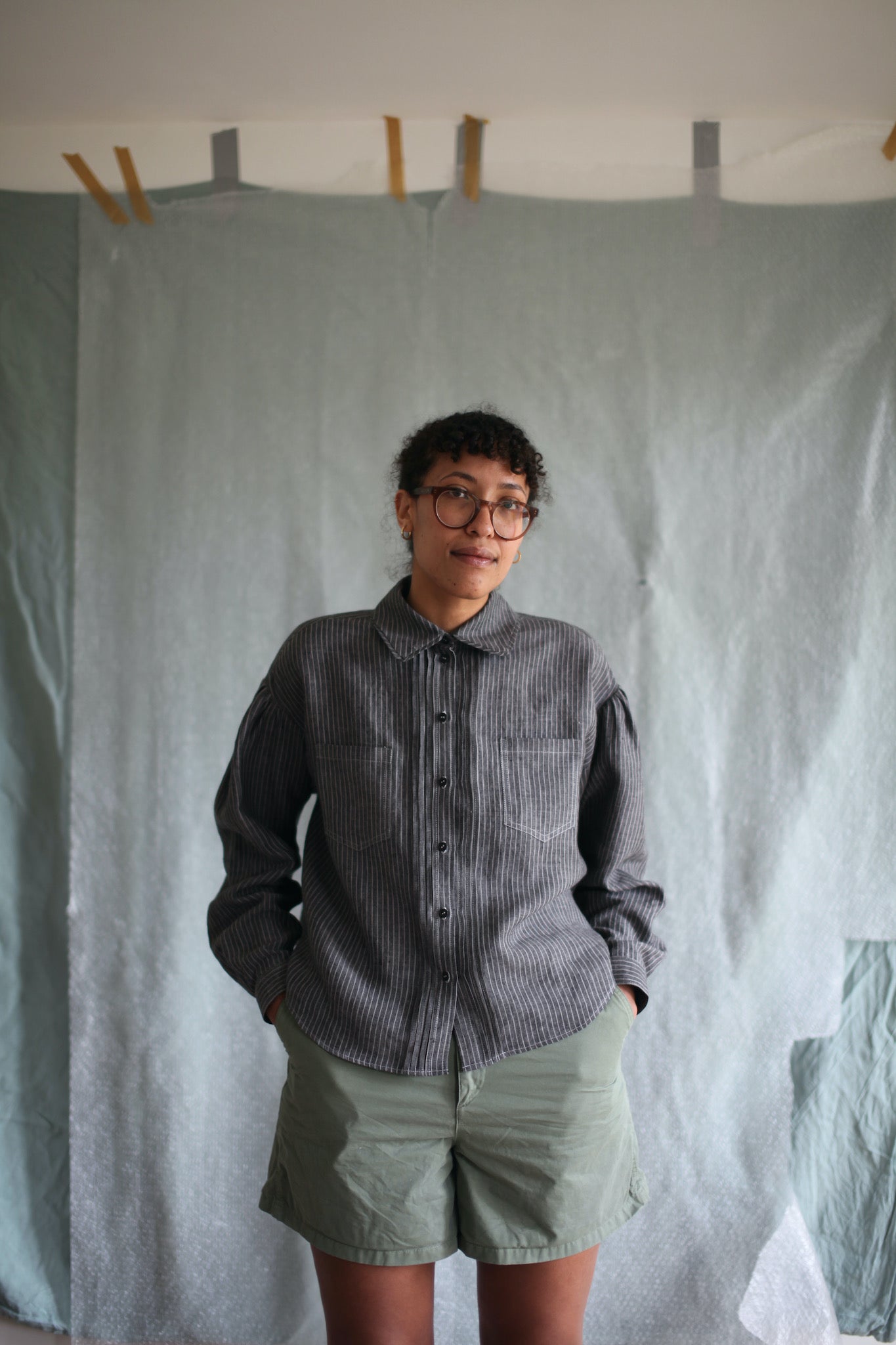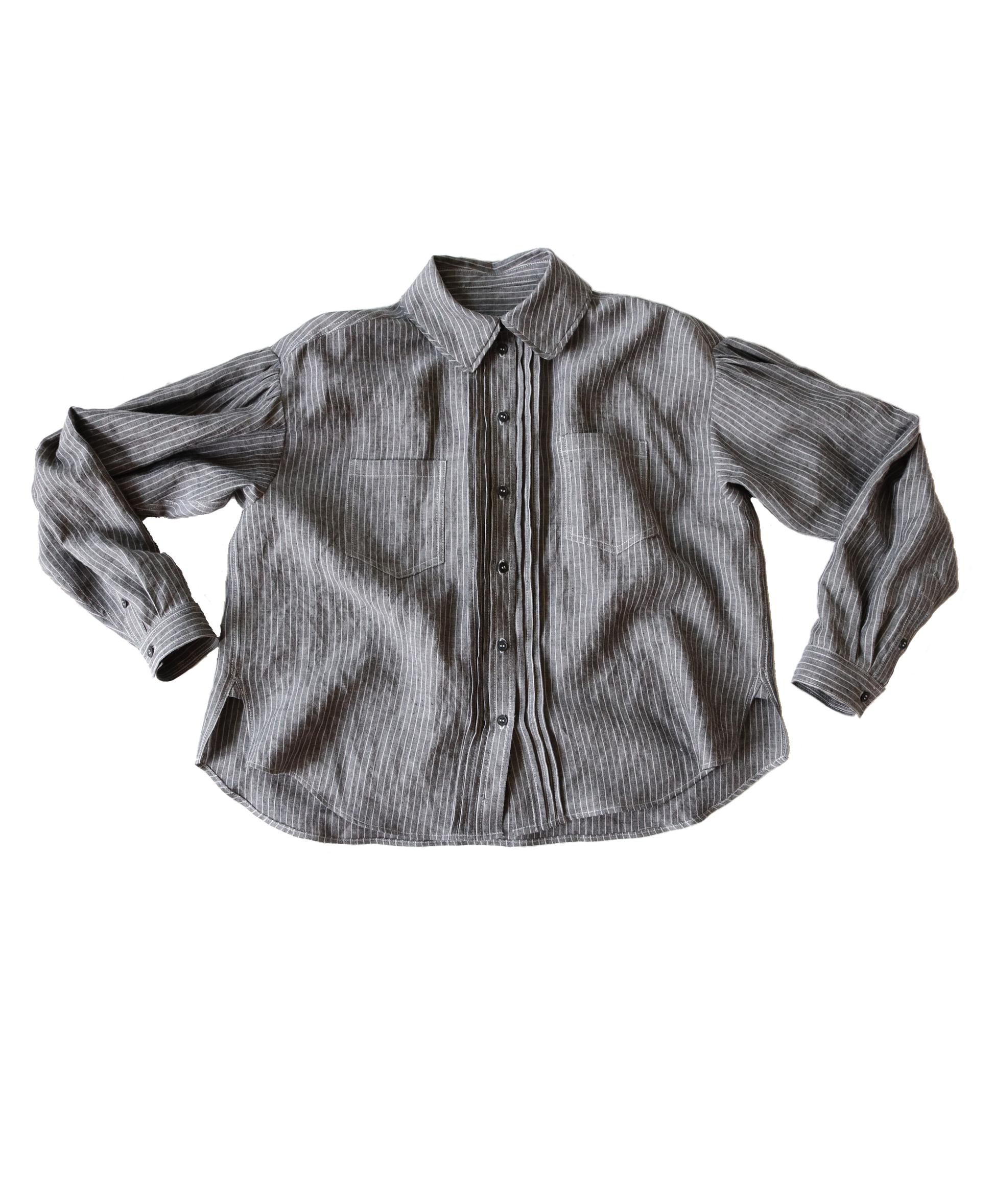 The Thea shirt in Granite is an 100% linen shirt in dark grey colour with a fine white stripe. The matte black buttons are made from compacted cotton fibres. It is a loose fitting slightly cropped linen shirt with side splits. It has two breast pockets, fine pleats down the centre front either side of the button stand, and flat piping around the collar edge which reflects the pleats. The sleeves are extra drop shouldered and voluminous, gathered at the sleeve head tapering towards the cuff. It looks great worn open, sleeves rolled up, or smartly buttoned up to the collar! It is long enough to wear tucked in with high/mid waist trousers.